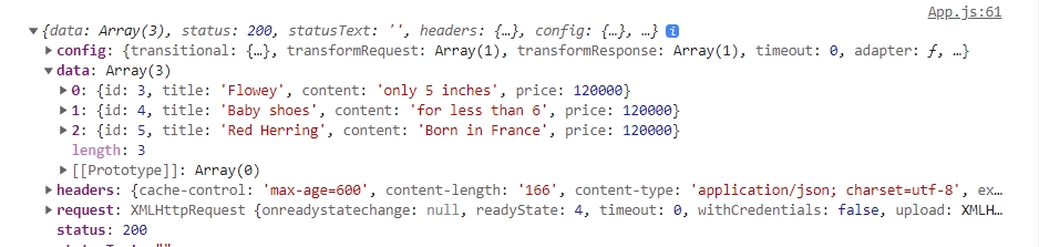 * axios를 사용하면 JSON을 Object로 알아서 바꿔줍니다. (만약 순수 자바스크립트 문법 fetch()를 사용한다면 JSON으로 출력)